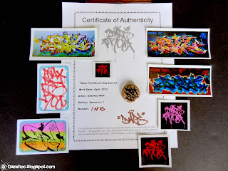 There's only 5 hand painted bags rocked by yours truly. All bags come filled with the now sold out "BURNER" sticker #1. It also contains the next two sticker in the "BURNER" series that have not been released. So you would be the first to get them and also assure yourself that you got them. The first one sold out in a week. Goodie bag also contains 2 "DAZEROC TAG" sticker in the regular size and an additional mini one not for sale. Bags also contain 1 "DAZE" handstyle slap tag and also one of the thought after "DZ" throwie slaps. Last but not least you also get a "DAZE" hand painted button and a certificate of authenticity. The package contains 11 pieces all together. Again all hand done, signed, numbered with certificate of authenticity. Available for the ridiculous price of only $30!!! Get at me ASAP! Hit me up on Facebook (DazeRoc). These will sell out. Paypal payment accepted. They start shipping tomorrow morning. Peace and Blessings and thank you for checking in.